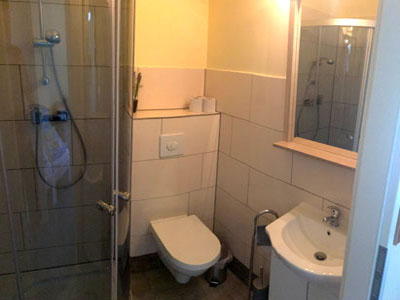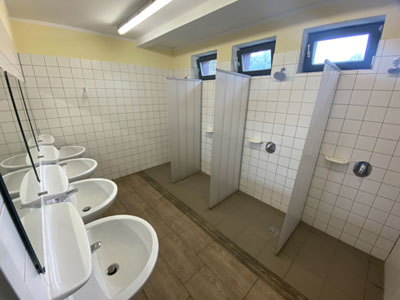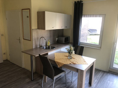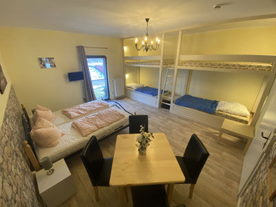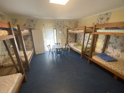 GÄSTEHAUS Für große Gruppen stehen im Gästehaus 3 Sechsbettzimmer und 3 Achtbettzimmer zur Verfügung. Moderne Gemeinschaftssanitärräume für Damen und Herren und ein Behindertenbad mit Dusche und eine Teeküche sind auf dem Gang. 2 Appartements mit kleinen Küchen und eigenem Bad und ein Doppelzimmer mit Bad sind im hinteren Teil des Gästehauses untergebracht. Über Terrassentüren gelangen Sie direkt in den Garten.