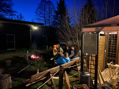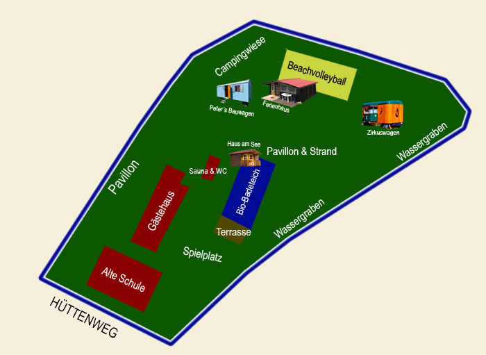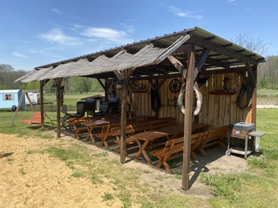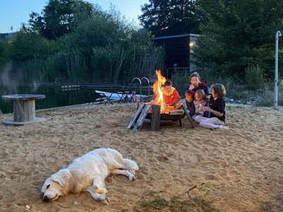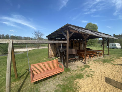 PAVILLON AM SEE Am kleinen Strand hinter dem Badeteich steht der große Pavillon. Hier finden ca. 30 Personen Platz. Ein Lagerfeuerplatz sorgt für eine gemütliche und warme Atmosphäre. Musikalisch lässt sich der Abend mit einem Bluetooth-Soundsystem untermalen. |