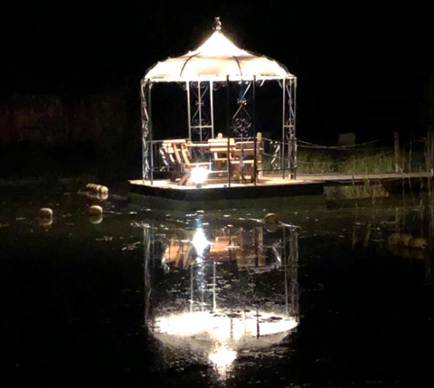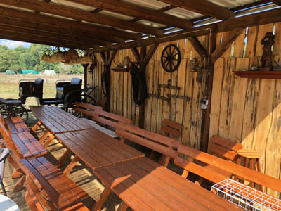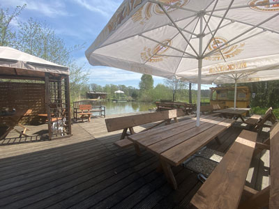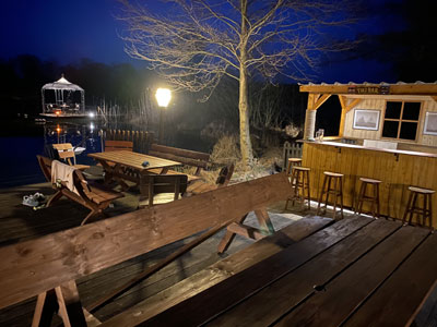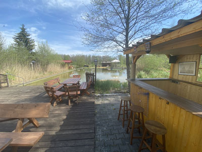 TERRRASSE MIT TIKIBAR Hier können unsere Gäste am Badeteich an großen Tischen unter Sonnenschirmen sitzen und den Abend genießen. Die Tikibar kann als Ausschank mit Zapfanlage und Kühlschrank genutzt werden. Eine Musikanlage mit Diskolicht wird über Bluetooth angesteuert. Am Grillplatz kann gegrillt und unter dem Pavillon ein Buffet aufgebaut werden. Einen Lagerfeuerplatz gibt es gleich neben der Terrasse. |