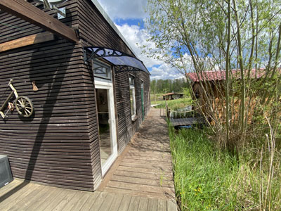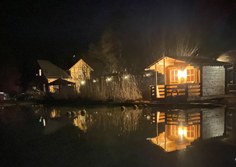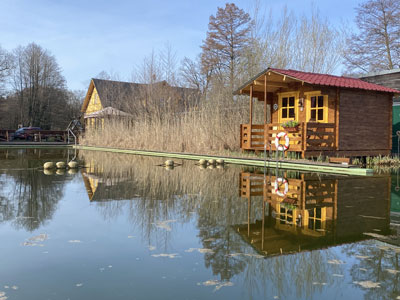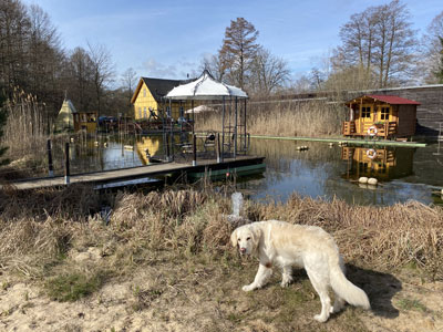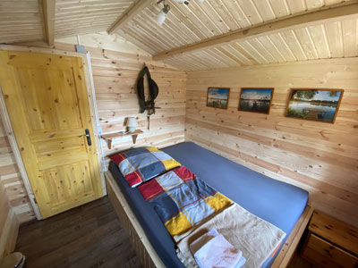 HAUS AM SEE Im Schilf über dem Wasser finden Sie ein besonderes Plätzchen zum Übernachten für 2 Personen. Von der eigenen Terasse mit Badeleiter können Sie direkt in den Badteich steigen. In der Sauna nebenan gibt es WC und Dusche. Zur Ausstattung gehören eine kleine Elektroheizung und TV. |