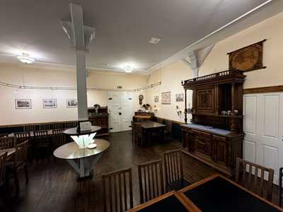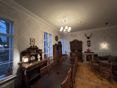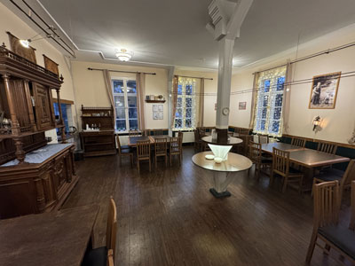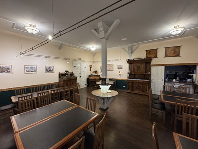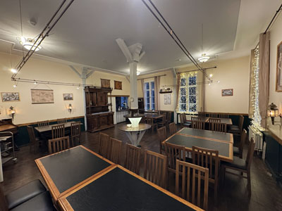 GROßER SAAL Im Saal finden bis zu 54 Personen Platz. Hier können zu jeder Jahreszeit Feierlichkeiten ausgerichtet werden. Die Dekoraton erinnert mit Exponaten und Bildern an das Schulleben vergangener Tage.