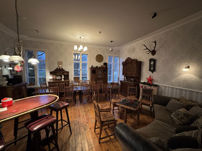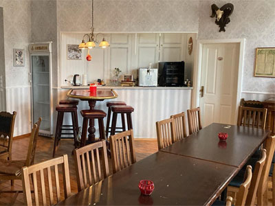 KAMINZIMMER Im Kaminzimmer finden an den Tischen 16 Personen Platz. Hier kann auch das Buffet aufgebaut werden. Einen Tresen mit 5 Barhockern gibt es ebenso. Hier finden Sie die Zapfanlage, den Getränkekühlschrank und Gläser.