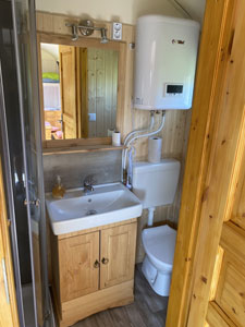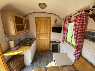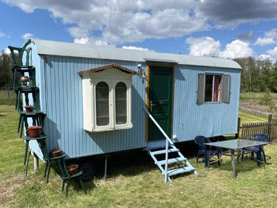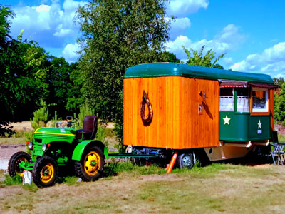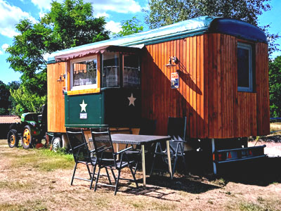 PETER´S BAUWAGEN Übernachten wie Peter Lustig (vermutlich etwas komfortabler). Unser Bauwagen bietet ein Bad mit Dusche, eine kleine Küche mit Sitzecke, Schlafplatz für 2 Erwachsene und Platz für ein Kind im Hochbett. Für kühlere Tage gibt es einen Elektrokamin außerdem TV. |