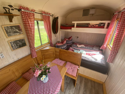 ZIRKUSWAGEN Der historische Zirkusdirektorwagen hat eine kleine Schlafkammer mit einem Bett ca. 160 x 200. Eine Couch kann zusätzlich für 2 Kinder aufgeklappt werden. Der Wagen verfügt über Dusche und WC. |