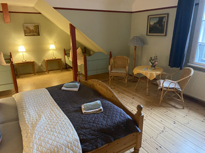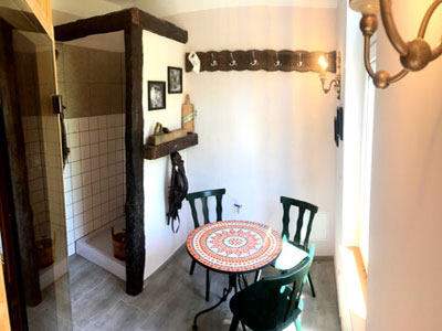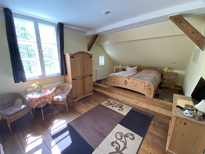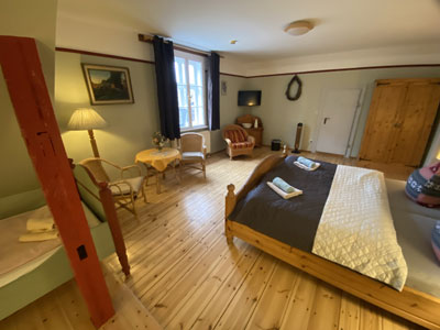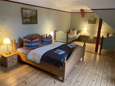 GÄSTEZIMMER "Alte Schule" Die Zimmer im Obergeschoß der alten Schule haben durch Ihre historischen Dielen, Türen und Balken einen besonderen Charme. Jedes Zimmer verfügt über ein eigenes Bad. Es gibt ein Doppelzimmer,2 Vierbettzimmer und ein Zimmer für maximal 5 Personen. In den Räumen und Fluren finden Sie viele Antiquitäten um sich in vergangene Zeiten zurückversetzten zu können. |
